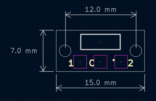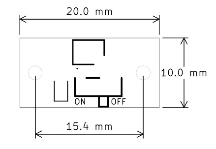 The micro slide switch mounted on a 15x7mm PCB with 2mm mounting holes at 12mm centre. The PCB has solder pads for attachment of lead-out wires.