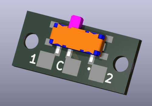 The micro slide switch mounted on a 15x7mm PCB with 2mm mounting holes at 12mm centre. The PCB has solder pads for attachment of lead-out wires.