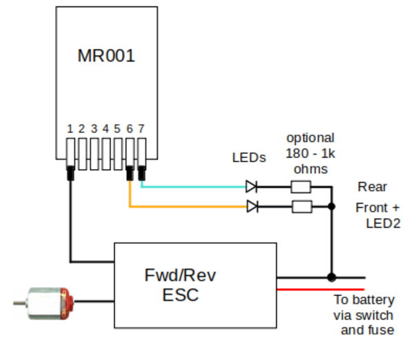 For live-steam use, MR001d outputs can be connected to standard R/C