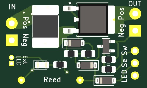 To switch on, a magnet is held close to the reed. The on-board LED lights and the output is turned on. After 2 seconds, the LED starts flashing and the magnet should be removed. If the magnet is removed before the LED starts flashing, the output is turned off. While the output is on, the LED flashes briefly every 6 seconds as a 'heart beat' indication. To switch off, the magnet is again held close to the reed. The LED will flash slowly for 3s and then flash rapidly. Removing the magnet while the LED is rapid flashing will turn the output off. Usage info (PDF).